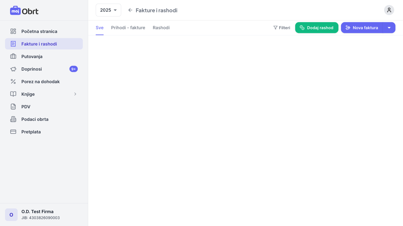 Kliknite na "Fakture i rashodi" u glavnom meniju. Na ovoj stranici vidite pregled svih vaših faktura i rashoda za odabranu godinu. U gornjem desnom uglu se nalaze dugmad "Dodaj rashod" i "Nova faktura". Pored dugmeta "Nova faktura" se nalazi strelica za kreiranje predračuna, što je detaljnije objašnjeno u posebnom vodiču.