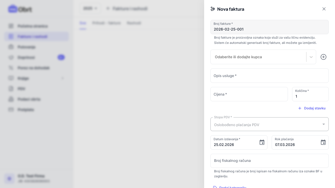 Kliknite dugme "Nova faktura". Otvoriće se forma sa svim potrebnim poljima: broj fakture (automatski generisan), polje za odabir kupca, stavke fakture, stopa PDV-a, datumi i napomene. Broj fakture možete prilagoditi prema vašoj želji.