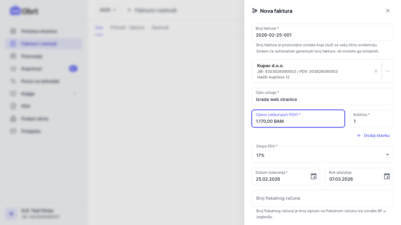 Ako ste u sistemu PDV-a, za svaku stavku možete odabrati stopu PDV-a (17% ili 0%). Ako je kupac PDV obveznik, stopa se automatski postavlja na 17%. Sistem automatski obračunava PDV i prikazuje razdvojeno osnovicu i porez.