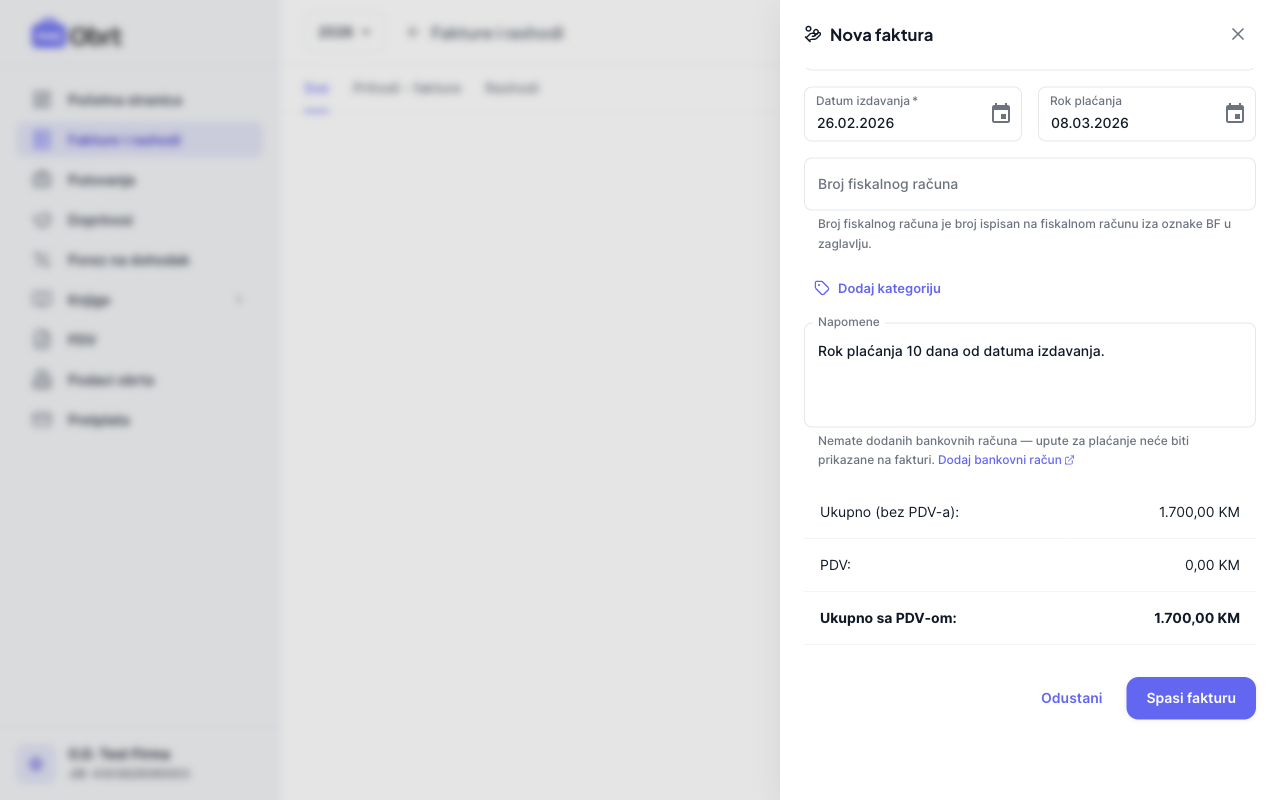 Na dnu forme vidite automatski izračunate iznose: ukupno bez PDV-a, PDV i ukupno sa PDV-om. Ako niste u sistemu PDV-a, PDV neće biti obračunat i ukupan iznos će biti jednak iznosu bez PDV-a. Provjerite datum izdavanja i rok plaćanja (automatski postavljen na 10 dana). Opcionalno dodajte napomenu i broj fiskalnog računa. Kliknite "Spasi fakturu" da kreirate fakturu.