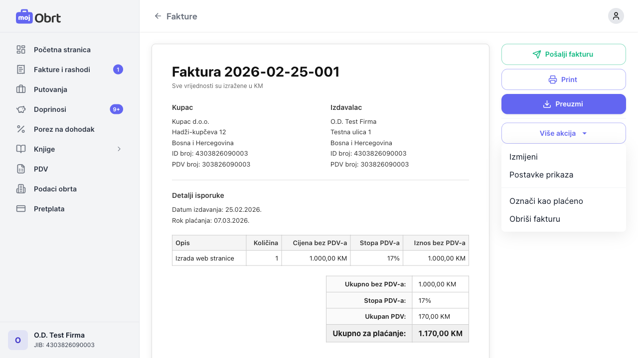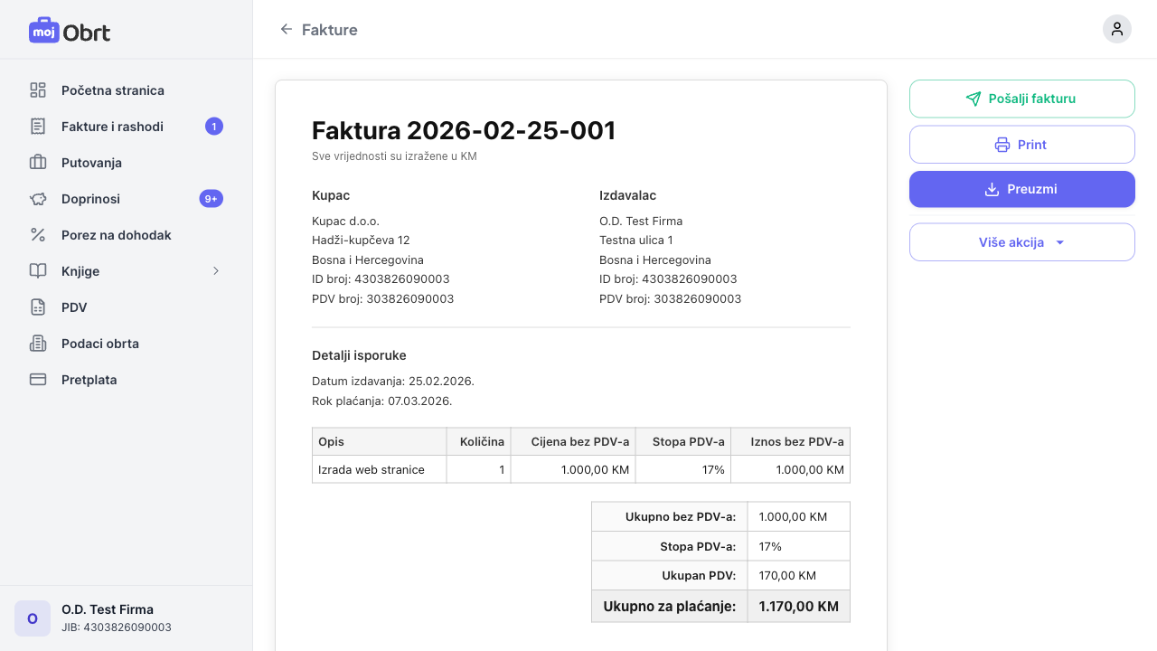 PDF fakture možete preuzeti klikom na "Preuzmi" ili je direktno isprintati klikom na "Print". PDF sadrži sve zakonski obavezne elemente uključujući logo obrta, podatke kupca i izdavaoca, stavke, iznose i bankovni račun.