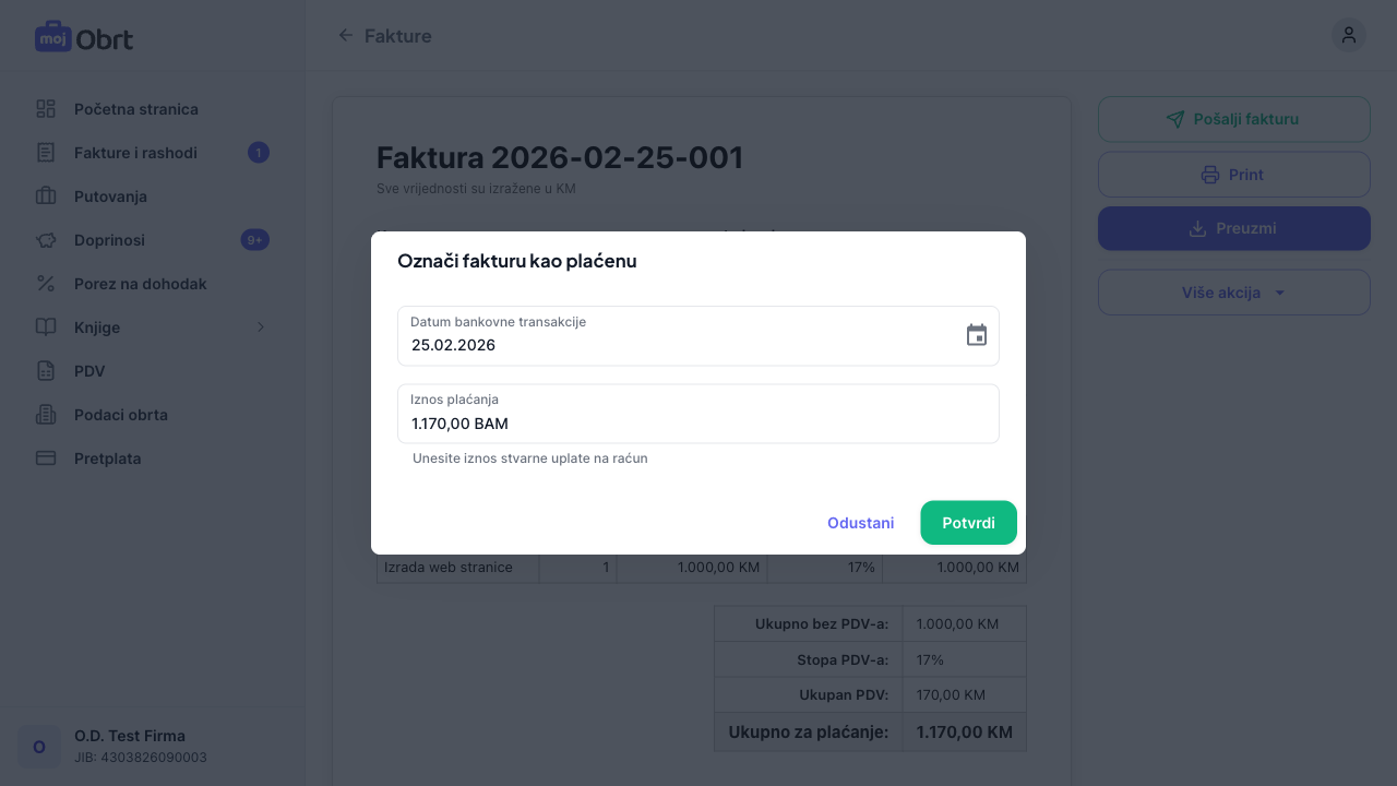 Kada kupac izvrši uplatu, kliknite "Označi kao plaćeno" u meniju Više akcija. U dijalogu unesite datum bankovne transakcije i iznos plaćanja (automatski popunjen ukupnim iznosom fakture). Kliknite "Potvrdi" da evidentirate uplatu.