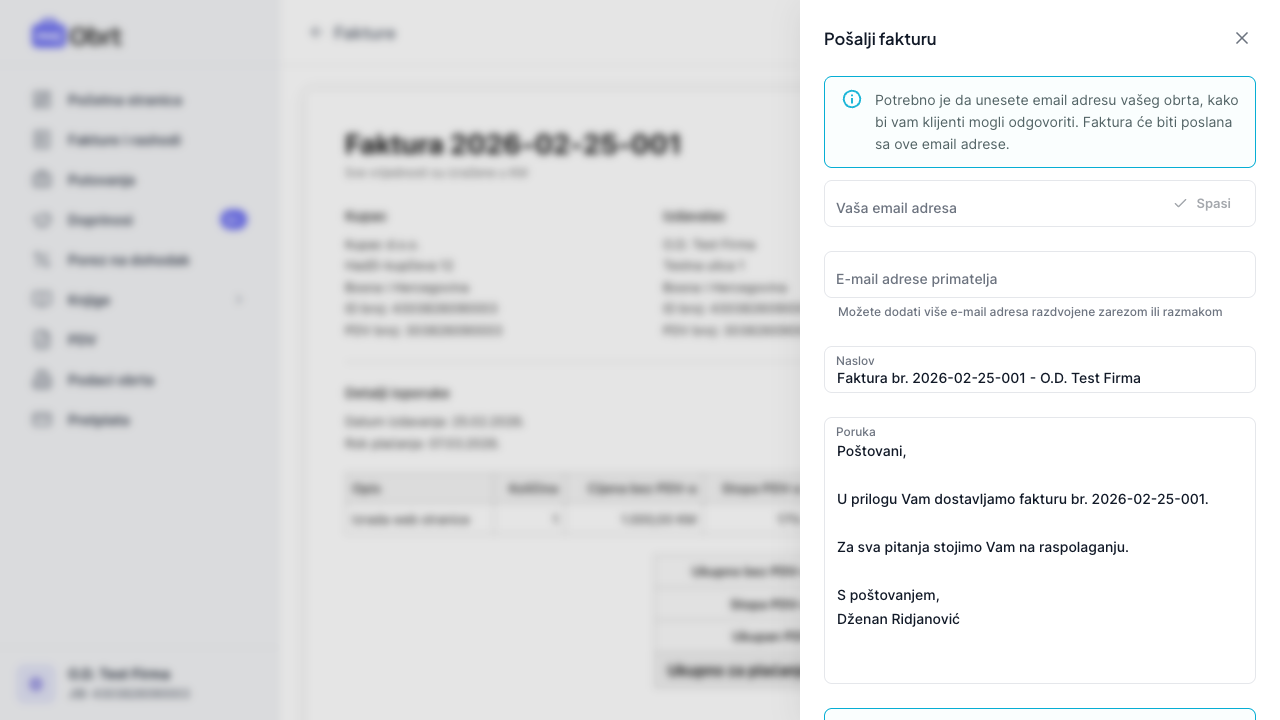 Kliknite "Pošalji fakturu" da otvorite formu za slanje. Unesite email adresu vašeg obrta (pošiljaoc), email adrese primatelja, pregledajte naslov i poruku. PDF fakture se automatski prilaže uz email.