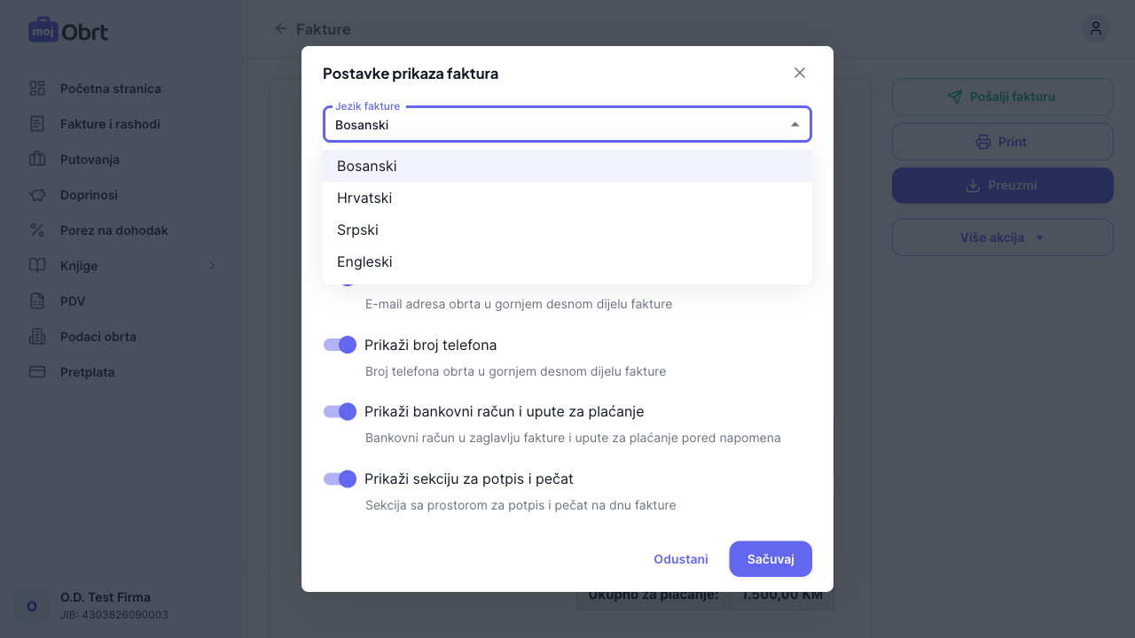 Kliknite "Više akcija" → "Postavke prikaza" da otvorite postavke prikaza fakture. U padajućem meniju "Jezik fakture" odaberite željeni jezik: bosanski, hrvatski, srpski ili engleski. Promjena jezika utječe na sve natpise na fakturi (zaglavlja, oznake polja, itd.). Također možete prilagoditi koje podatke o vašem obrtu prikazati na fakturama: e-mail adresu, broj telefona, bankovni račun i sekciju za potpis i pečat.